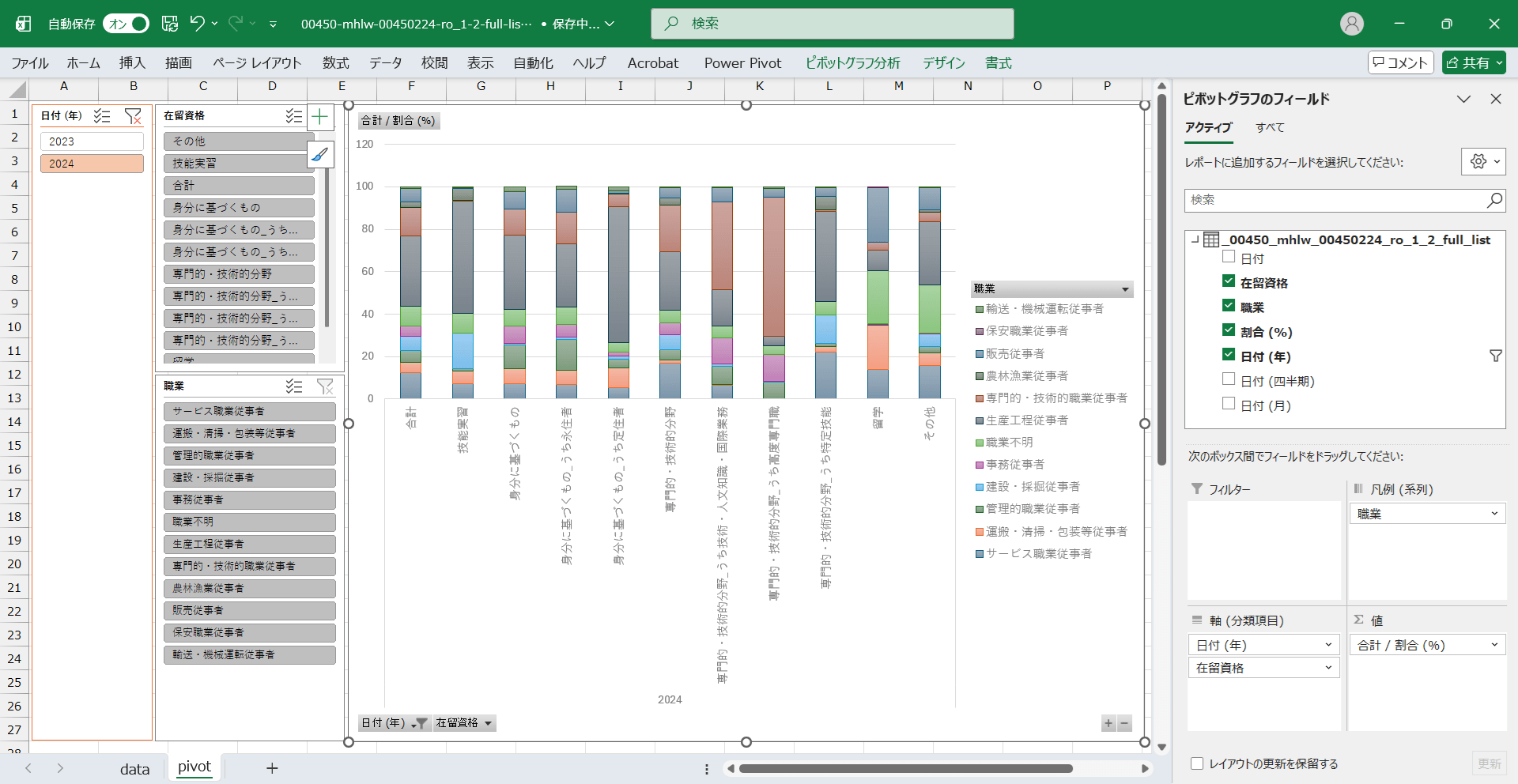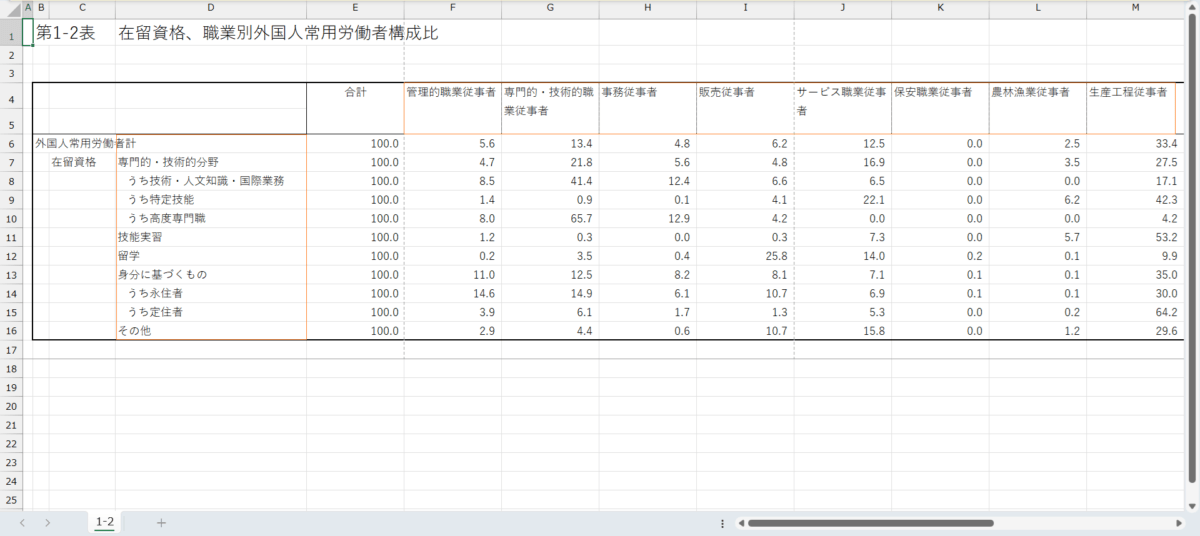 外国人雇用実態調査_労働者調査_表1-2_在留資格、職業別外国人常用労働者構成比_年次 2023年 – 2024年 (列指向形式)