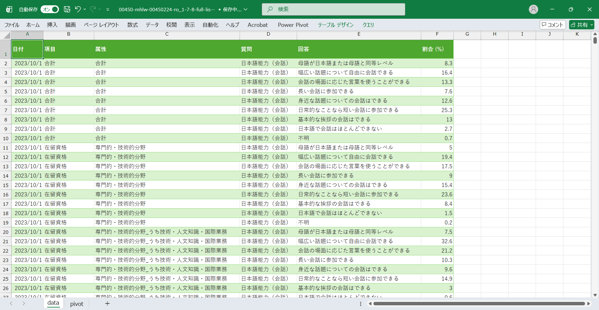 日付,項目,属性,質問,回答,割合 (%) 2023/10/1,合計,合計,日本語能力(会話),母語が日本語または母語と同等レベル,8.3 2023/10/1,合計,合計,日本語能力(会話),幅広い話題について自由に会話できる,16.4 2023/10/1,合計,合計,日本語能力(会話),会話の場面に応じた言葉を使うことができる,13.3 2023/10/1,合計,合計,日本語能力(会話),長い会話に参加できる,7.6 2023/10/1,合計,合計,日本語能力(会話),身近な話題についての会話はできる,12.6 2023/10/1,合計,合計,日本語能力(会話),日常的なことなら短い会話に参加できる,25.3 2023/10/1,合計,合計,日本語能力(会話),基本的な挨拶の会話はできる,13 2023/10/1,合計,合計,日本語能力(会話),日本語で会話はほとんどできない,2.7 2023/10/1,合計,合計,日本語能力(会話),不明,0.7