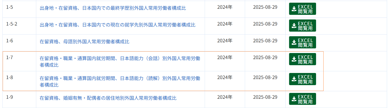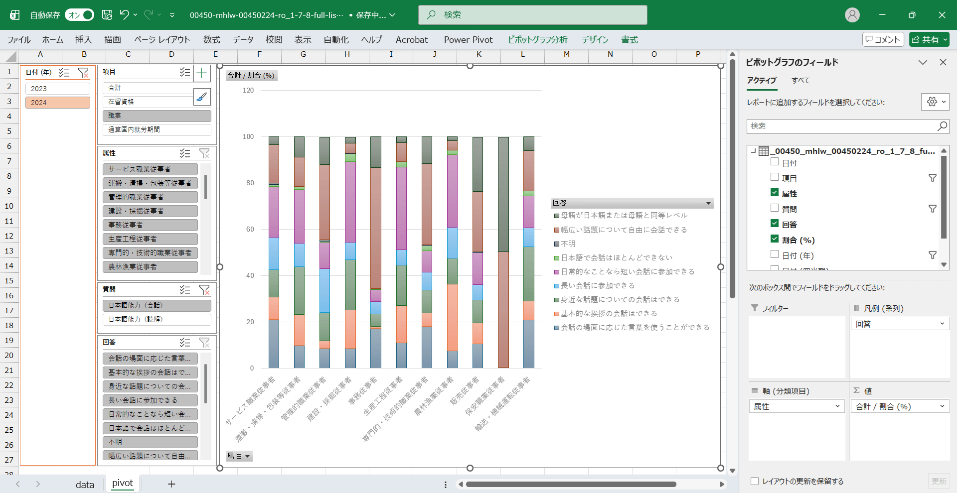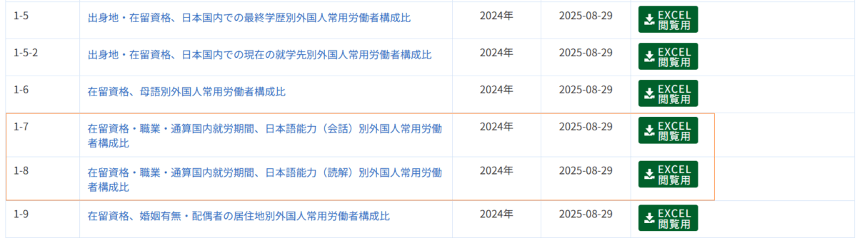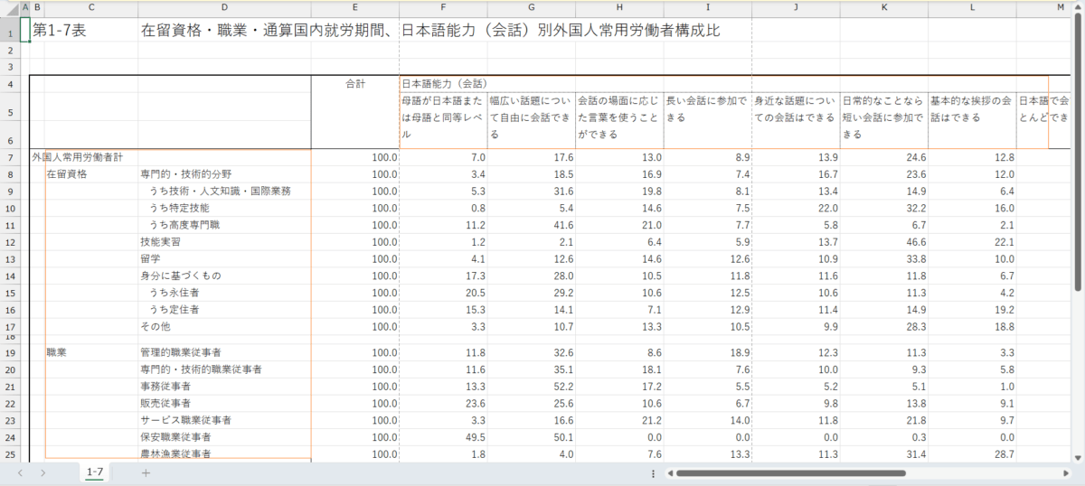 外国人雇用実態調査_労働者調査_表1-7-8_在留資格・職業・通算国内就労期間、日本語能力(会話・読解)別外国人常用労働者構成比_年次 2023年 – 2024年 (列指向形式)