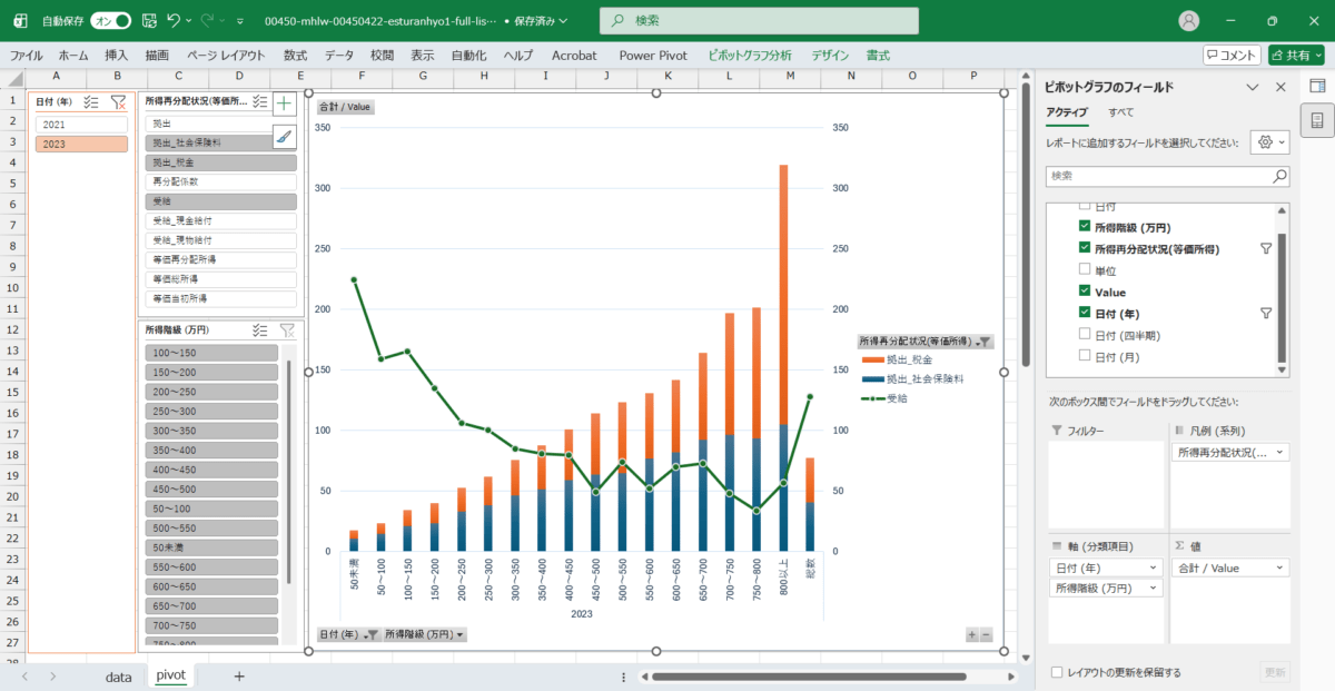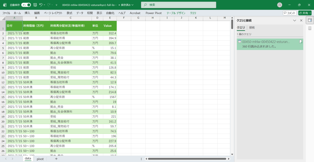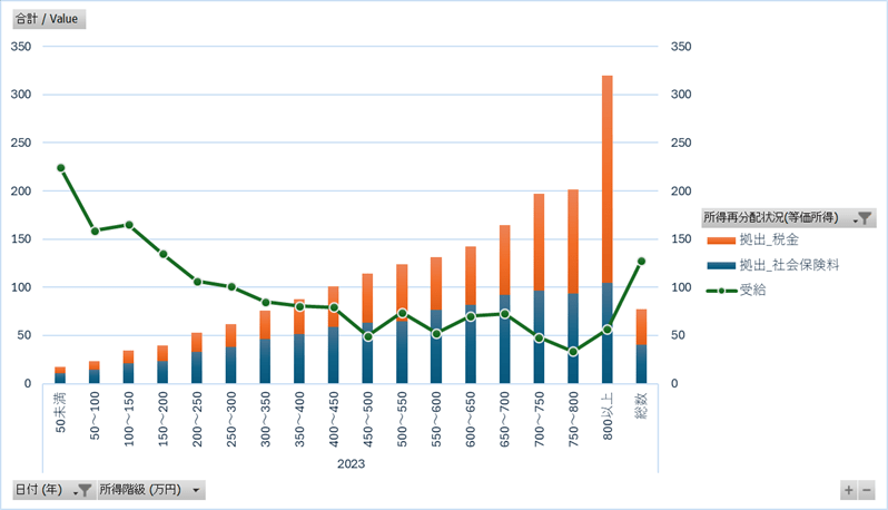日付,所得階級 (万円),所得再分配状況(等価所得),単位,Value 2021/7/15,総数,等価当初所得,万円,312.4 2021/7/15,総数,等価総所得,万円,394.9 2021/7/15,総数,等価再分配所得,万円,359.7 2021/7/15,総数,再分配係数,%,15.1 2021/7/15,総数,拠出,万円,79.6 2021/7/15,総数,拠出_税金,万円,38.1 2021/7/15,総数,拠出_社会保険料,万円,41.5 2021/7/15,総数,受給,万円,126.8 2021/7/15,総数,受給_現金給付,万円,82.5