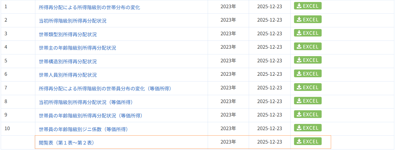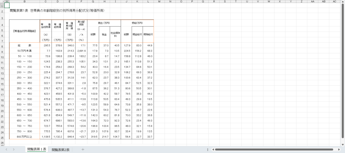 | 4~7行の各列の名称 | 所得再分配状況(等価所得) |