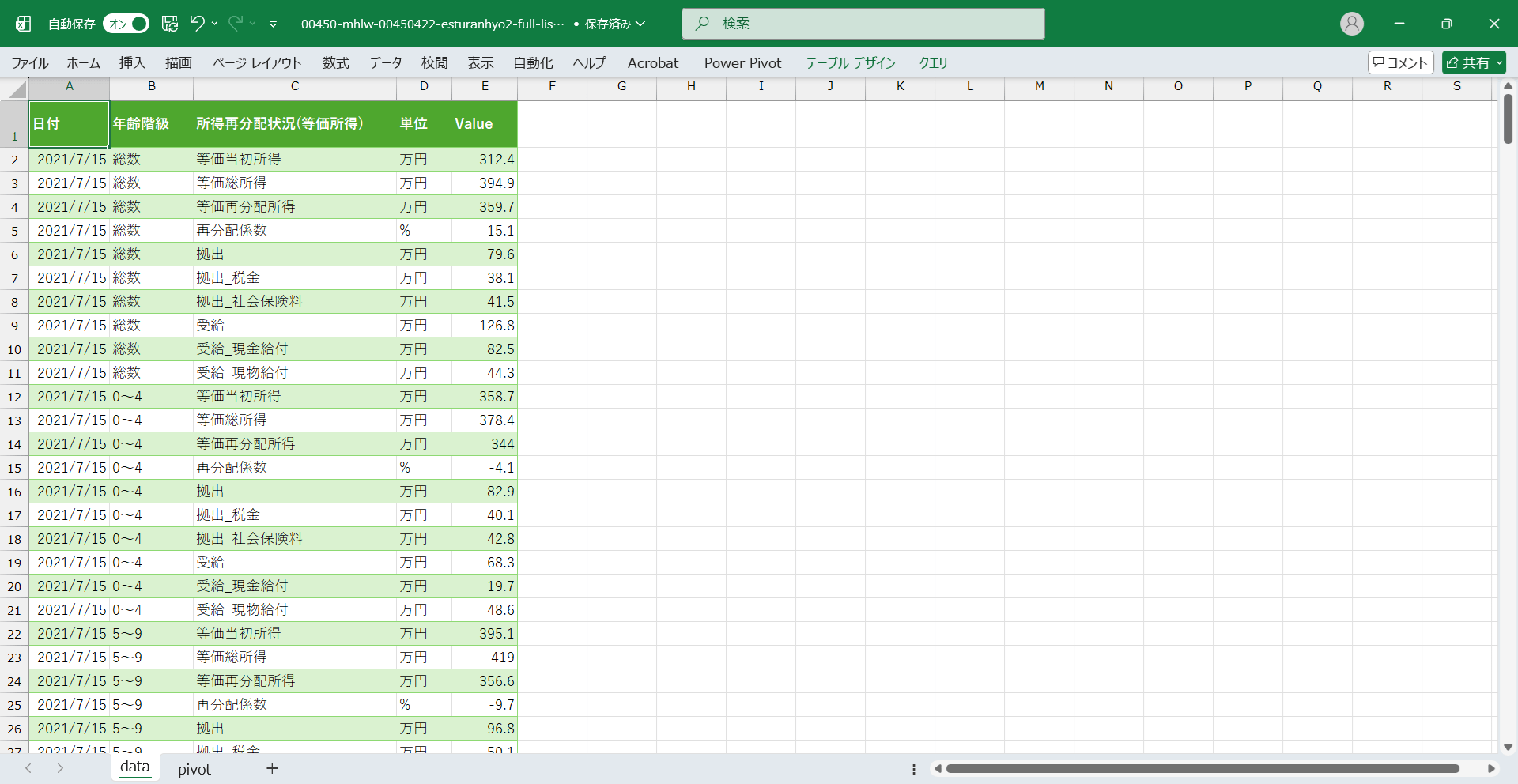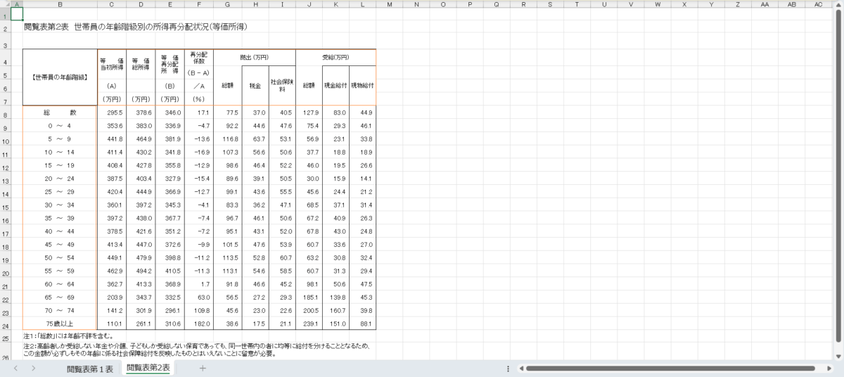 | 4~7行の各列の名称 | 所得再分配状況(等価所得) |