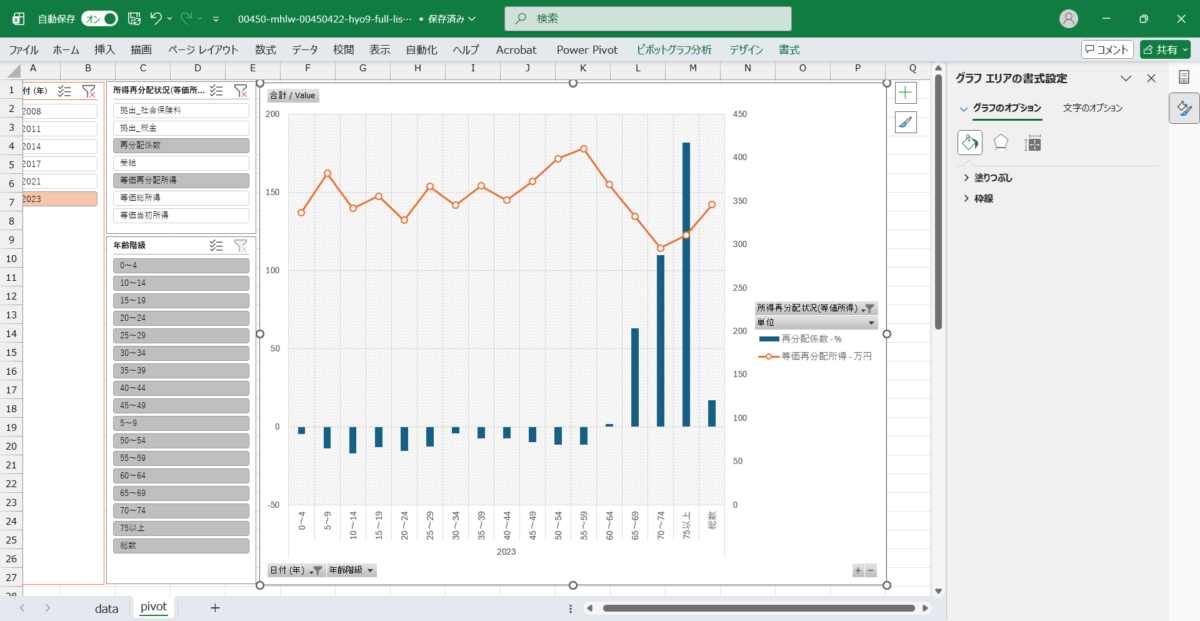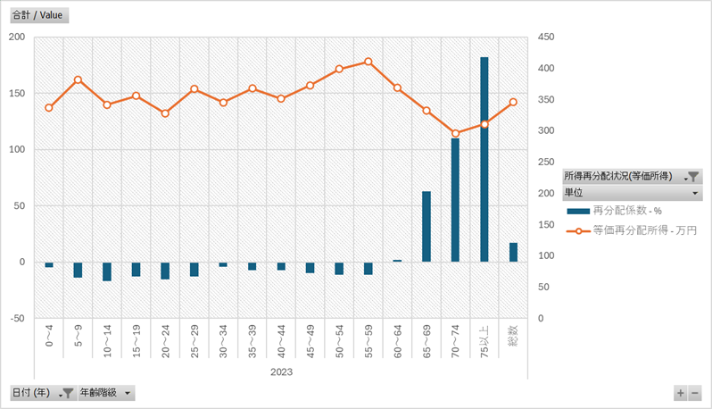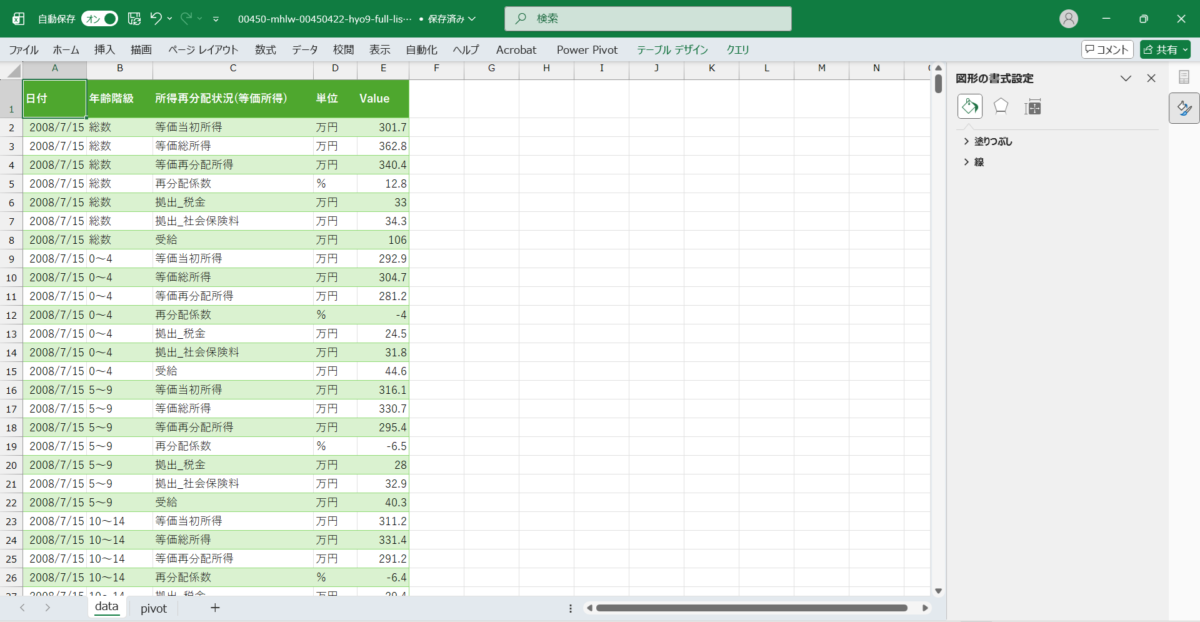 | 4~6行の各列の名称 | 所得再分配状況(等価所得)、単位 |