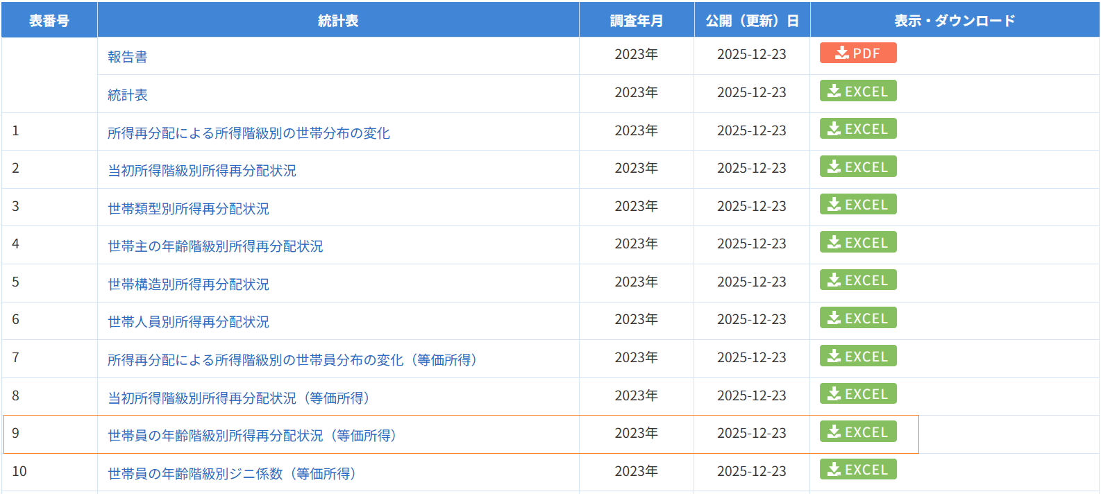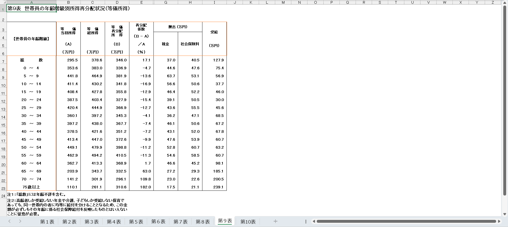 所得再配分調査_表9_世帯員の年齢階級別所得再分配状況(等価所得)_年次 2008年 – 2023年 (列指向形式)