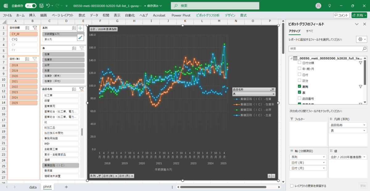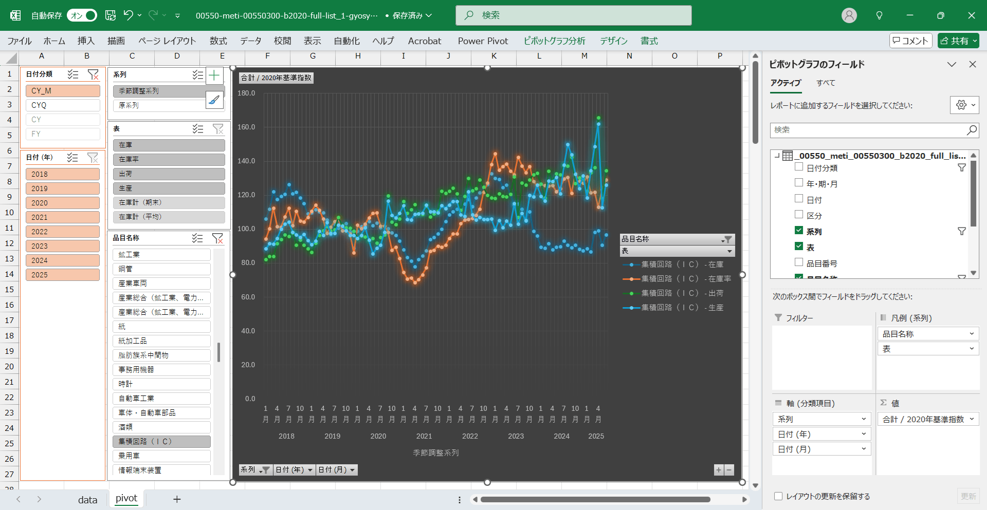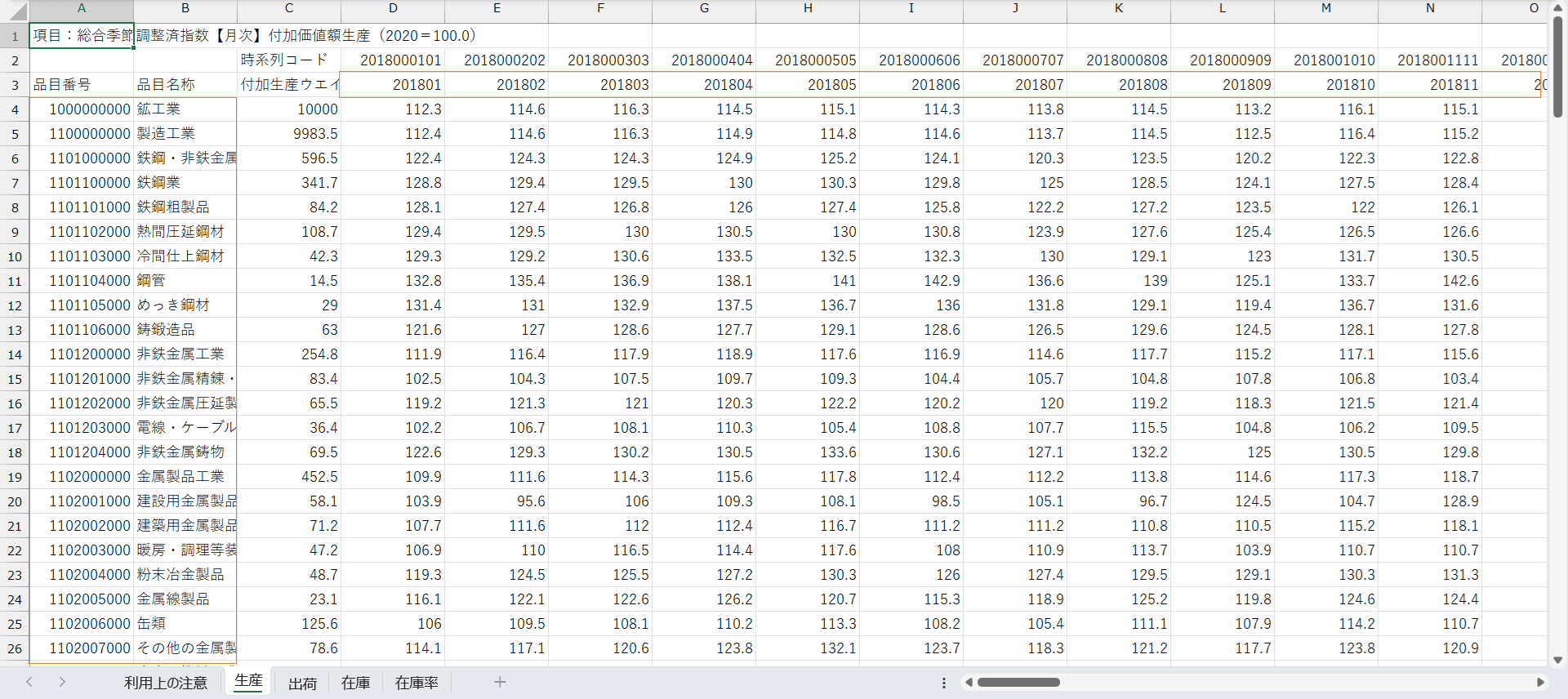 鉱工業生産・出荷・在庫指数_2020基準_1_業種別_月次 2018年1月 – 2025年11月 (列指向形式)