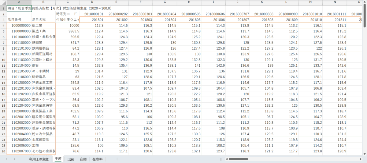 日付分類,年・期・月,日付,区分,系列,表,品目番号,品目名称,2020年基準指数 CY,2018CY,2018/1/1,業種別,原系列,生産,1000000000,鉱工業,114.6 CYQ,2018Q1,2018/1/1,業種別,原系列,生産,1000000000,鉱工業,114.9 CY,2018CY,2018/1/1,業種別,原系列,出荷,1000000000,鉱工業,114.9 CYQ,2018Q1,2018/1/1,業種別,原系列,出荷,1000000000,鉱工業,116 CY,2018CY,2018/1/1,業種別,原系列,在庫計(期末),1000000000,鉱工業,100.5 CYQ,2018Q1,2018/1/1,業種別,原系列,在庫計(期末),1000000000,鉱工業,99.6 CY,2018CY,2018/1/1,業種別,原系列,在庫計(平均),1000000000,鉱工業,102.6 CYQ,2018Q1,2018/1/1,業種別,原系列,在庫計(平均),1000000000,鉱工業,101.7 CY,2018CY,2018/1/1,業種別,原系列,在庫率,1000000000,鉱工業,85.5