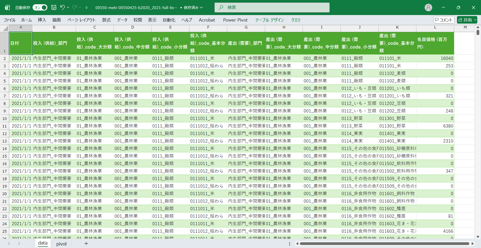 日付,投入 (供給)_部門,投入 (供給)_code_大分類,投入 (供給)_code_中分類,投入 (供給)_code_小分類,投入 (供給)_code_基本分類,産出 (需要)_部門,産出 (需要)_code_大分類,産出 (需要)_code_中分類,産出 (需要)_code_小分類,産出 (需要)_code_基本分類,名目価格 (百万円) 2021/1/1,内生部門_中間投入,01_農林漁業 ,001_農林業,0111_穀類,0111011_米,内生部門_中間需要,01_農林漁業 ,001_農林業,0111_穀類,011101_米,16040 2021/1/1,内生部門_中間投入,01_農林漁業 ,001_農林業,0111_穀類,0111012_稲わら,内生部門_中間需要,01_農林漁業 ,001_農林業,0111_穀類,011101_米,253 2021/1/1,内生部門_中間投入,01_農林漁業 ,001_農林業,0111_穀類,0111011_米,内生部門_中間需要,01_農林漁業 ,001_農林業,0111_穀類,011102_麦類,0 2021/1/1,内生部門_中間投入,01_農林漁業 ,001_農林業,0111_穀類,0111012_稲わら,内生部門_中間需要,01_農林漁業 ,001_農林業,0111_穀類,011102_麦類,0 2021/1/1,内生部門_中間投入,01_農林漁業 ,001_農林業,0111_穀類,0111011_米,内生部門_中間需要,01_農林漁業 ,001_農林業,0112_いも・豆類,011201_いも類,0 2021/1/1,内生部門_中間投入,01_農林漁業 ,001_農林業,0111_穀類,0111012_稲わら,内生部門_中間需要,01_農林漁業 ,001_農林業,0112_いも・豆類,011201_いも類,321 2021/1/1,内生部門_中間投入,01_農林漁業 ,001_農林業,0111_穀類,0111011_米,内生部門_中間需要,01_農林漁業 ,001_農林業,0112_いも・豆類,011202_豆類,0 2021/1/1,内生部門_中間投入,01_農林漁業 ,001_農林業,0111_穀類,0111012_稲わら,内生部門_中間需要,01_農林漁業 ,001_農林業,0112_いも・豆類,011202_豆類,248 2021/1/1,内生部門_中間投入,01_農林漁業 ,001_農林業,0111_穀類,0111011_米,内生部門_中間需要,01_農林漁業 ,001_農林業,0113_野菜,011301_野菜,0