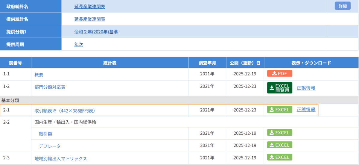 延長産業連関表は、総務省をはじめとする関係府省庁の共同事業により5年ごとに作成される「産業連関表(基本表)をベンチマークとして、最新情報を取り込みつつ可能な限り最新時点の産業構造を反映させることを目的に、「産業連関表(基本表)」の中間年を補間する位置づけとして、基本分類により作成している。(経済産業省HPから引用)