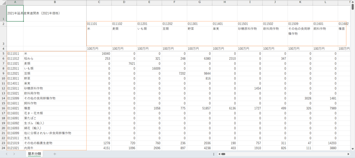| A~B列の各行の名称 | 投入 (供給)_code_基本分類 「1-2 部門分類対応表」と結合して、投入 (供給)_code_大分類、投入 (供給)_code_中分類、投入 (供給)_code_小分類を作成 小計・合計に該当する値はありません。 |