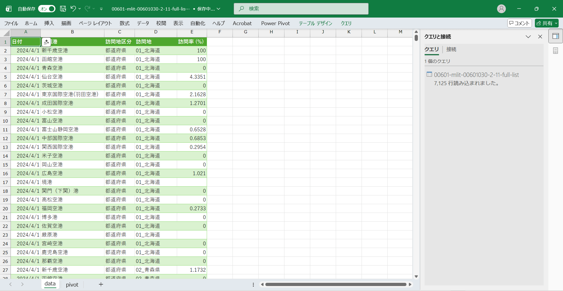 日付,出国港,訪問地区分,訪問地,訪問率 (%) 2024/4/1,新千歳空港,都道府県,01_北海道,100 2024/4/1,函館空港,都道府県,01_北海道,100 2024/4/1,青森空港,都道府県,01_北海道,0 2024/4/1,仙台空港,都道府県,01_北海道,4.3351 2024/4/1,茨城空港,都道府県,01_北海道,0 2024/4/1,東京国際空港(羽田空港),都道府県,01_北海道,2.1628 2024/4/1,成田国際空港,都道府県,01_北海道,1.2701 2024/4/1,小松空港,都道府県,01_北海道,0 2024/4/1,富山空港,都道府県,01_北海道,0