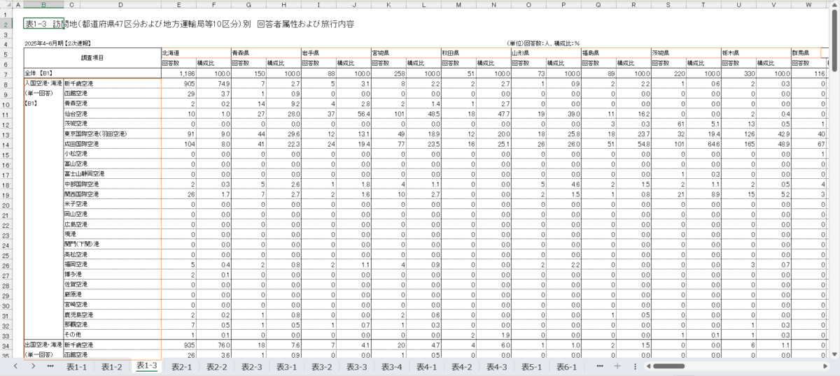 日付,目的,訪問地区分,訪問地,SA or MA,調査項目,回答者属性および旅行内容,割合 (%) 2024/4/1,全目的,都道府県別,01_北海道,SA,01_入国空港・海港,新千歳空港,71.785 2024/4/1,全目的,都道府県別,01_北海道,SA,01_入国空港・海港,函館空港,6.2528 2024/4/1,全目的,都道府県別,01_北海道,SA,01_入国空港・海港,青森空港,0 2024/4/1,全目的,都道府県別,01_北海道,SA,01_入国空港・海港,仙台空港,0.3473 2024/4/1,全目的,都道府県別,01_北海道,SA,01_入国空港・海港,茨城空港,0 2024/4/1,全目的,都道府県別,01_北海道,SA,01_入国空港・海港,東京国際空港(羽田空港),8.2518 2024/4/1,全目的,都道府県別,01_北海道,SA,01_入国空港・海港,成田国際空港,8.7861 2024/4/1,全目的,都道府県別,01_北海道,SA,01_入国空港・海港,小松空港,0 2024/4/1,全目的,都道府県別,01_北海道,SA,01_入国空港・海港,富山空港,0