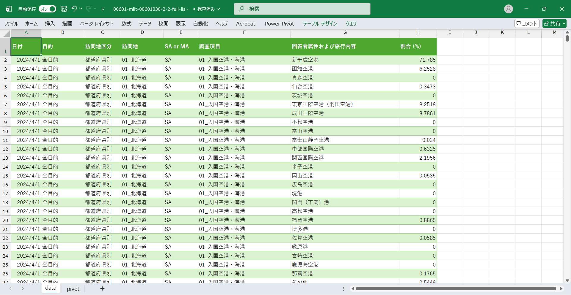 日付,目的,訪問地区分,訪問地,SA or MA,調査項目,回答者属性および旅行内容,割合 (%) 2024/4/1,全目的,都道府県別,01_北海道,SA,01_入国空港・海港,新千歳空港,71.785 2024/4/1,全目的,都道府県別,01_北海道,SA,01_入国空港・海港,函館空港,6.2528 2024/4/1,全目的,都道府県別,01_北海道,SA,01_入国空港・海港,青森空港,0 2024/4/1,全目的,都道府県別,01_北海道,SA,01_入国空港・海港,仙台空港,0.3473 2024/4/1,全目的,都道府県別,01_北海道,SA,01_入国空港・海港,茨城空港,0 2024/4/1,全目的,都道府県別,01_北海道,SA,01_入国空港・海港,東京国際空港(羽田空港),8.2518 2024/4/1,全目的,都道府県別,01_北海道,SA,01_入国空港・海港,成田国際空港,8.7861 2024/4/1,全目的,都道府県別,01_北海道,SA,01_入国空港・海港,小松空港,0 2024/4/1,全目的,都道府県別,01_北海道,SA,01_入国空港・海港,富山空港,0