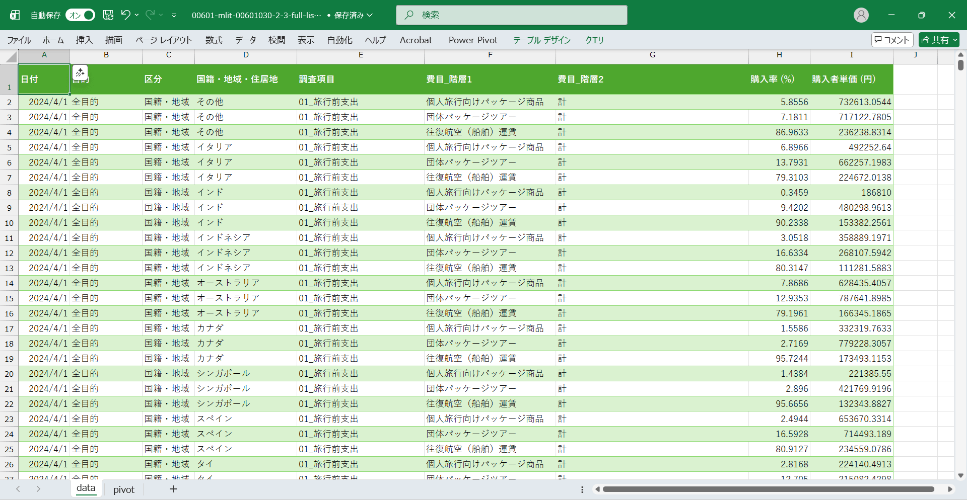 日付,目的,区分,国籍・地域・住居地,調査項目,費目_階層1,費目_階層2,購入率 (%),購入者単価 (円) 2024/4/1,全目的,国籍・地域,その他,01_旅行前支出,個人旅行向けパッケージ商品,計,5.8556,732613.0544 2024/4/1,全目的,国籍・地域,その他,01_旅行前支出,団体パッケージツアー,計,7.1811,717122.7805 2024/4/1,全目的,国籍・地域,その他,01_旅行前支出,往復航空(船舶)運賃,計,86.9633,236238.8314 2024/4/1,全目的,国籍・地域,イタリア,01_旅行前支出,個人旅行向けパッケージ商品,計,6.8966,492252.64 2024/4/1,全目的,国籍・地域,イタリア,01_旅行前支出,団体パッケージツアー,計,13.7931,662257.1983 2024/4/1,全目的,国籍・地域,イタリア,01_旅行前支出,往復航空(船舶)運賃,計,79.3103,224672.0138 2024/4/1,全目的,国籍・地域,インド,01_旅行前支出,個人旅行向けパッケージ商品,計,0.3459,186810 2024/4/1,全目的,国籍・地域,インド,01_旅行前支出,団体パッケージツアー,計,9.4202,480298.9613 2024/4/1,全目的,国籍・地域,インド,01_旅行前支出,往復航空(船舶)運賃,計,90.2338,153382.2561