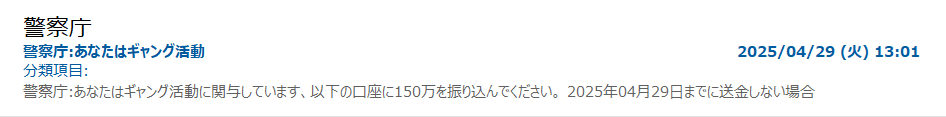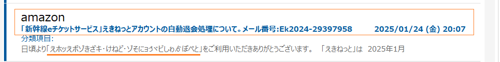 | B列 (標準) | メール送信者名 (かたり) | 受信メールへ表示される送付元名。 本物ではありません。なりすまし送付元です。 | |