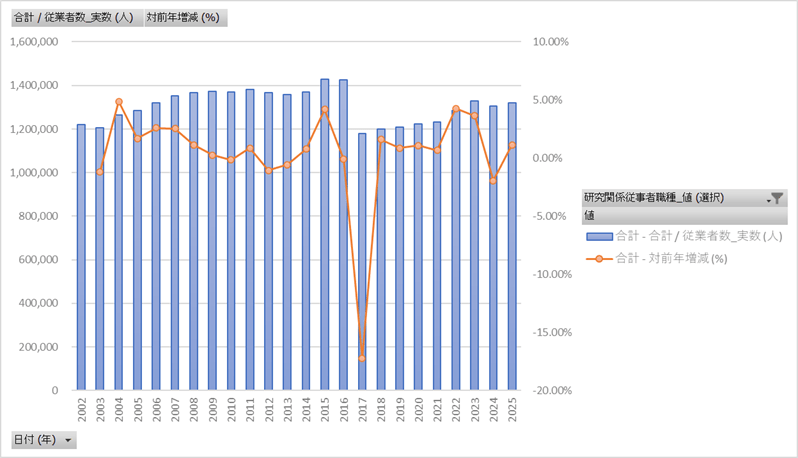 科学技術研究調査_表a101_究関係従業者数 (実数)_年次 2002年 – 2025年 (列指向形式)