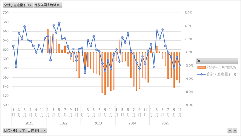 2025年12月26日公表値 主な乳製品の種類ごとの生産量が年月ごとにわかります。 このデータは「月